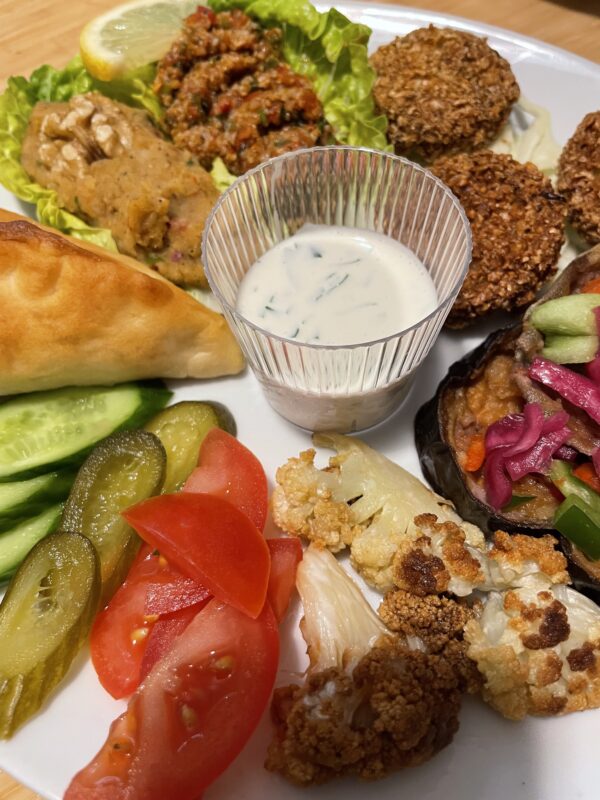 Hoofdgerecht (vrije bijdrage – richtprijs 15 euro): LIBANEES BORDJE (met o.a. tabouleh, fatayer, batata harra, …)